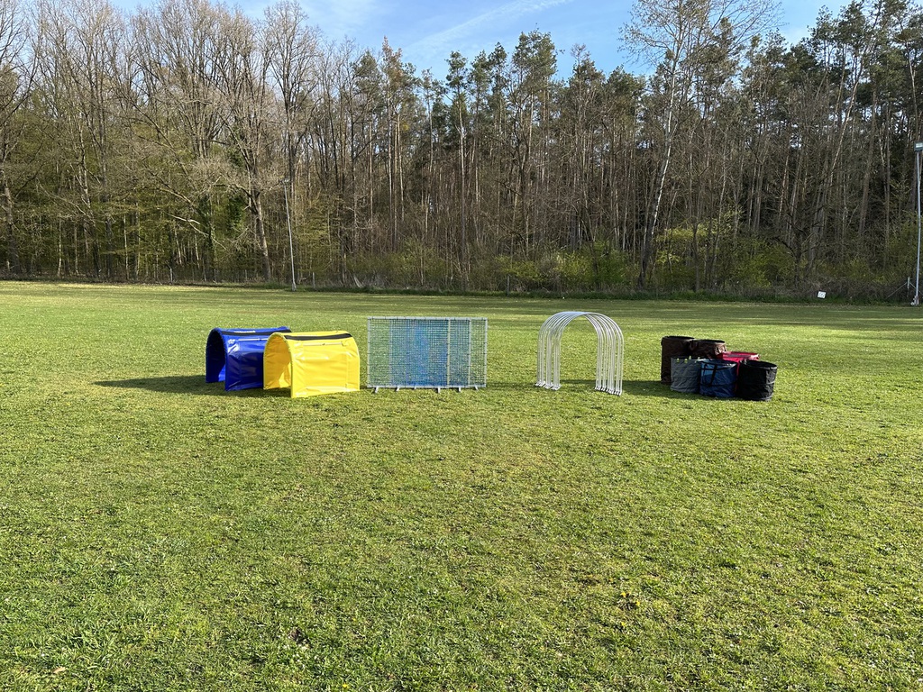 Der Geräteparcours, bestehend aus sogenannten Hoops, Tunneln, Tonnen und Gates, muss vom Hund in einer bestimmten Reihenfolge fehlerfrei durchlaufen werden.